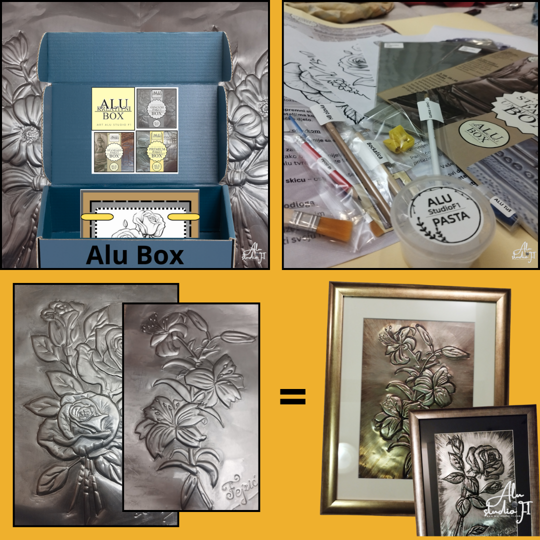 Osnovni Alu Box paket je savršen za početnike i one koji žele napraviti prvi korak u svijetu alu umjetnosti. Sadrži osnovne materijale , osnovne alate , skice i uputstvo koje vas vodi korak po korak do vašeg prvog alu remek-djela. Bez žurbe, bez stresa – samo vi, kreativnost i trenutak kada obična folija postaje priča . Osnovni Alu Box – "Prvi korak u umjetnost " Zamisli ovo: otvaraš kutiju, a iz nje izleti čarolija u obliku aluminijumske folije spremne da se pretvori u umjetničko djelo! Osnovni Alu Box je idealan za one koji tek ulaze u svijet reljefnog stvaranja . Sadrži sve što ti treba da započneš svoj prvi rad i osjetiš zadovoljstvo stvaranja vlastitim rukama . Šta dobijaš? Aluminijsku foliju Alate Skice Uputstvo korak po korak Motivaciju i umjetničku iskru . Savršeno za: Početnike, kreativce amatere i one koji žele otkriti novi hobi.