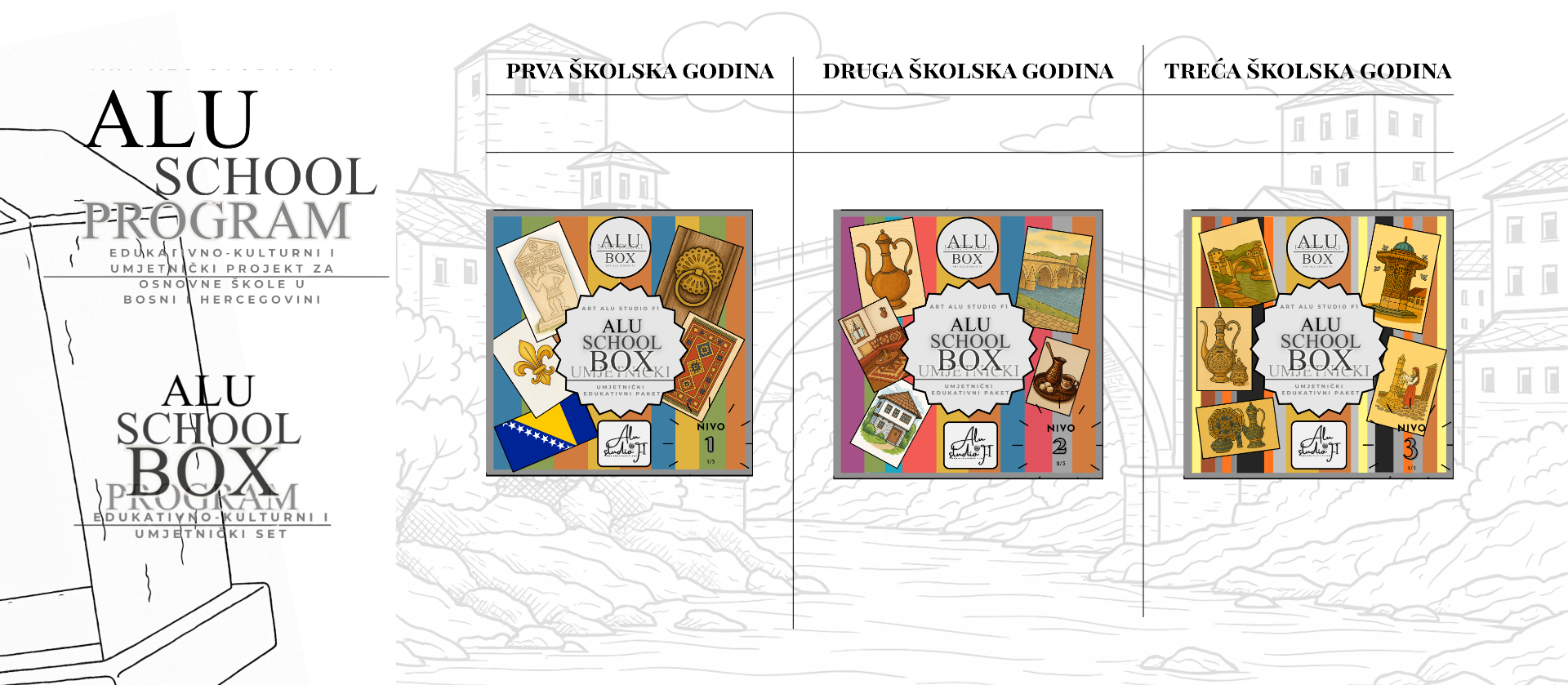 Kroz tri školske godine i tri nivoa Alu School Box paketa – prvi, drugi i treći nivo – učenici prolaze proces učenja osnova, razvoja i usavršavanja alu umjetnosti, stvarajući jedinstvena umjetnička djela inspirisana tradicijom, kulturom i simbolima kulturne baštine Bosne i Hercegovine.